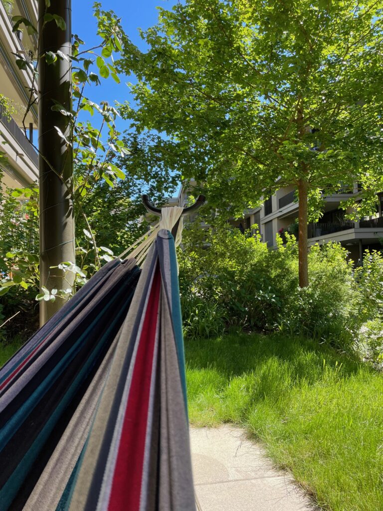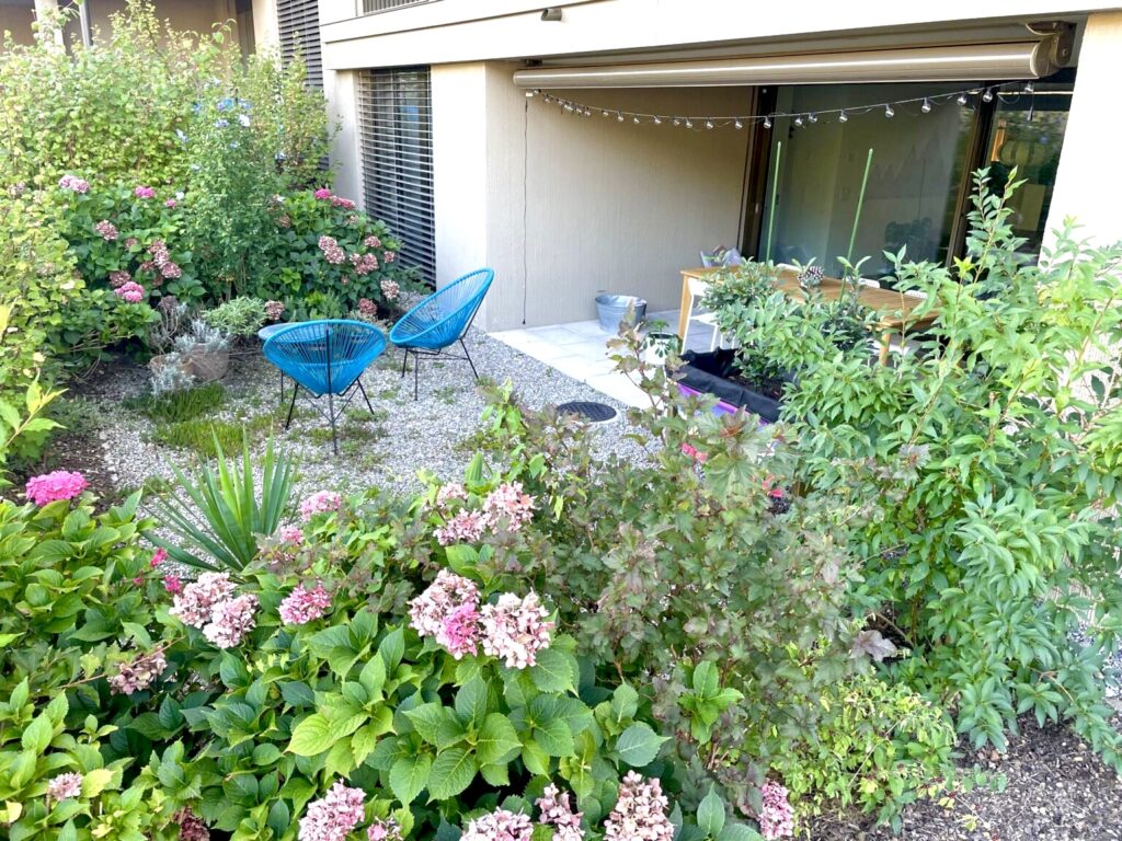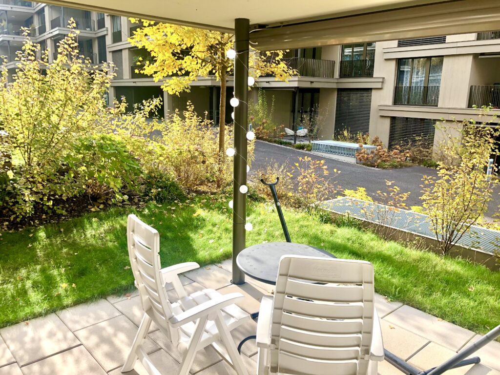Das Aussenraumkonzept der Überbauung ist bewusst nicht geradlinig gestaltet. Durch Bepflanzung, Gebüsche und natürliche Strukturen entsteht Privatsphäre, ohne Enge. Die Wohnung ist von Grün umgeben und gleichzeitig offen – ein geschützter Rückzugsort mitten in der Gartenstadt.