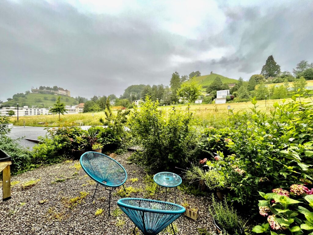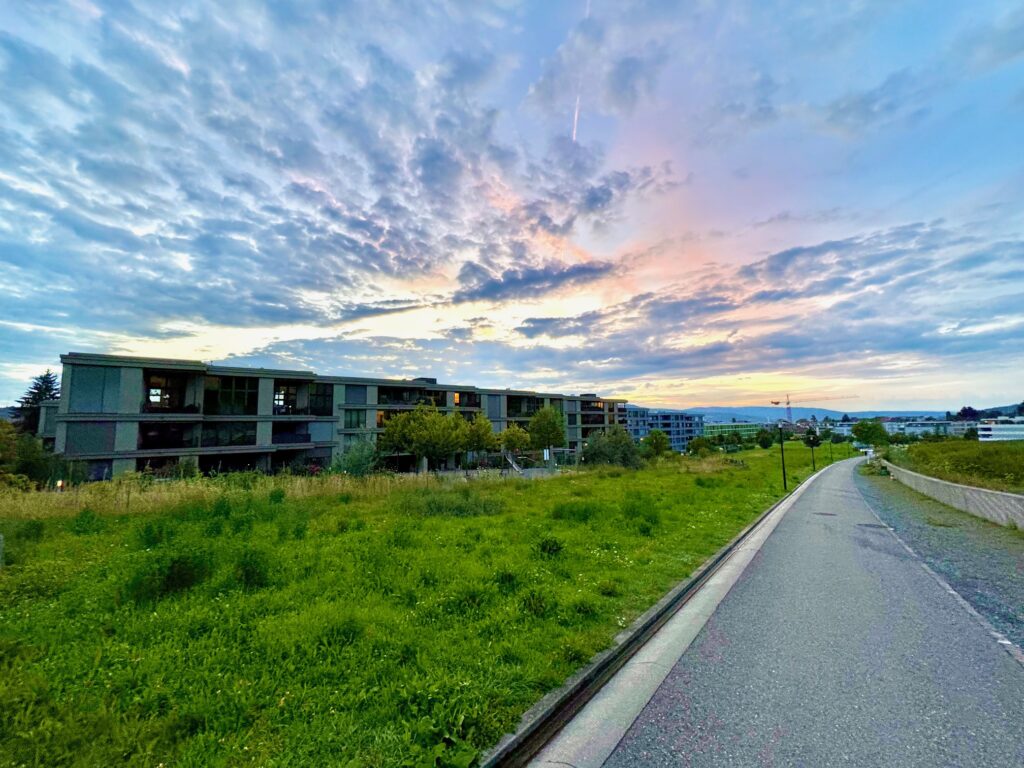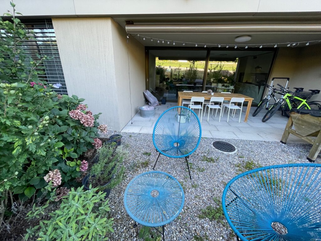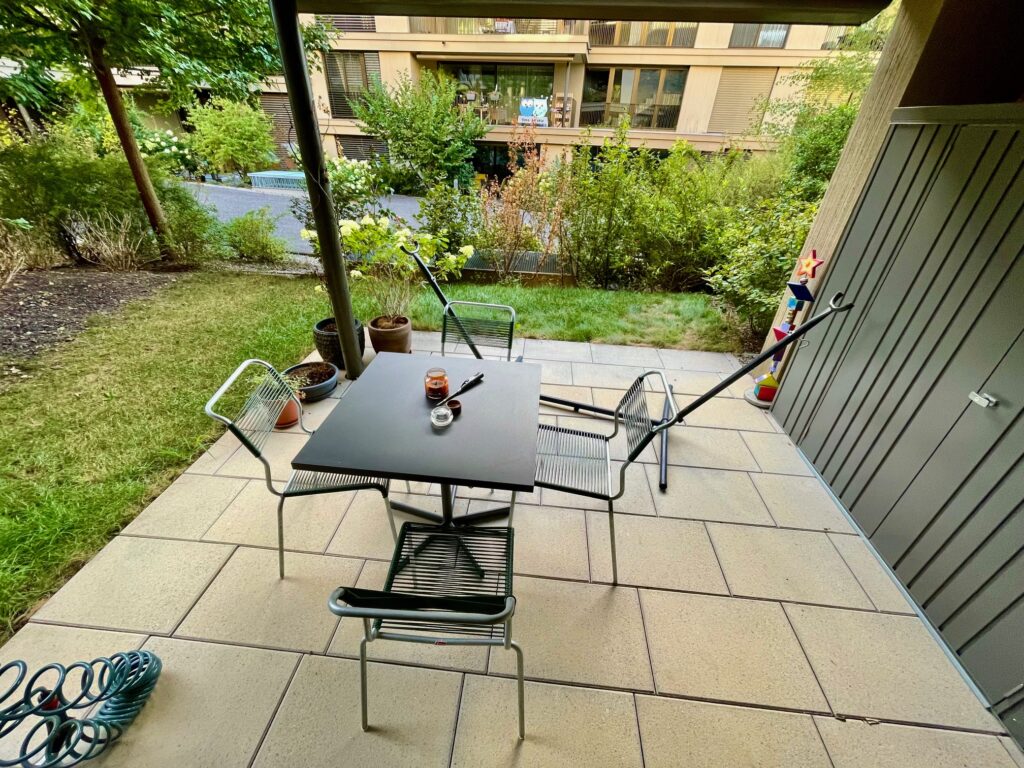 Dank Ost-West-Ausrichtung ist die Wohnung den ganzen Tag über lichtdurchflutet. Morgens beginnt der Tag mit Sonne auf dem östlichen Sitzplatz, abends lädt der westliche Aussenbereich zum Verweilen ein. Die Wohnung liegt ruhig und geschützt, ohne Durchgangsverkehr, eingebettet in die grüne Umgebung der Gartenstadt Lenzburg.