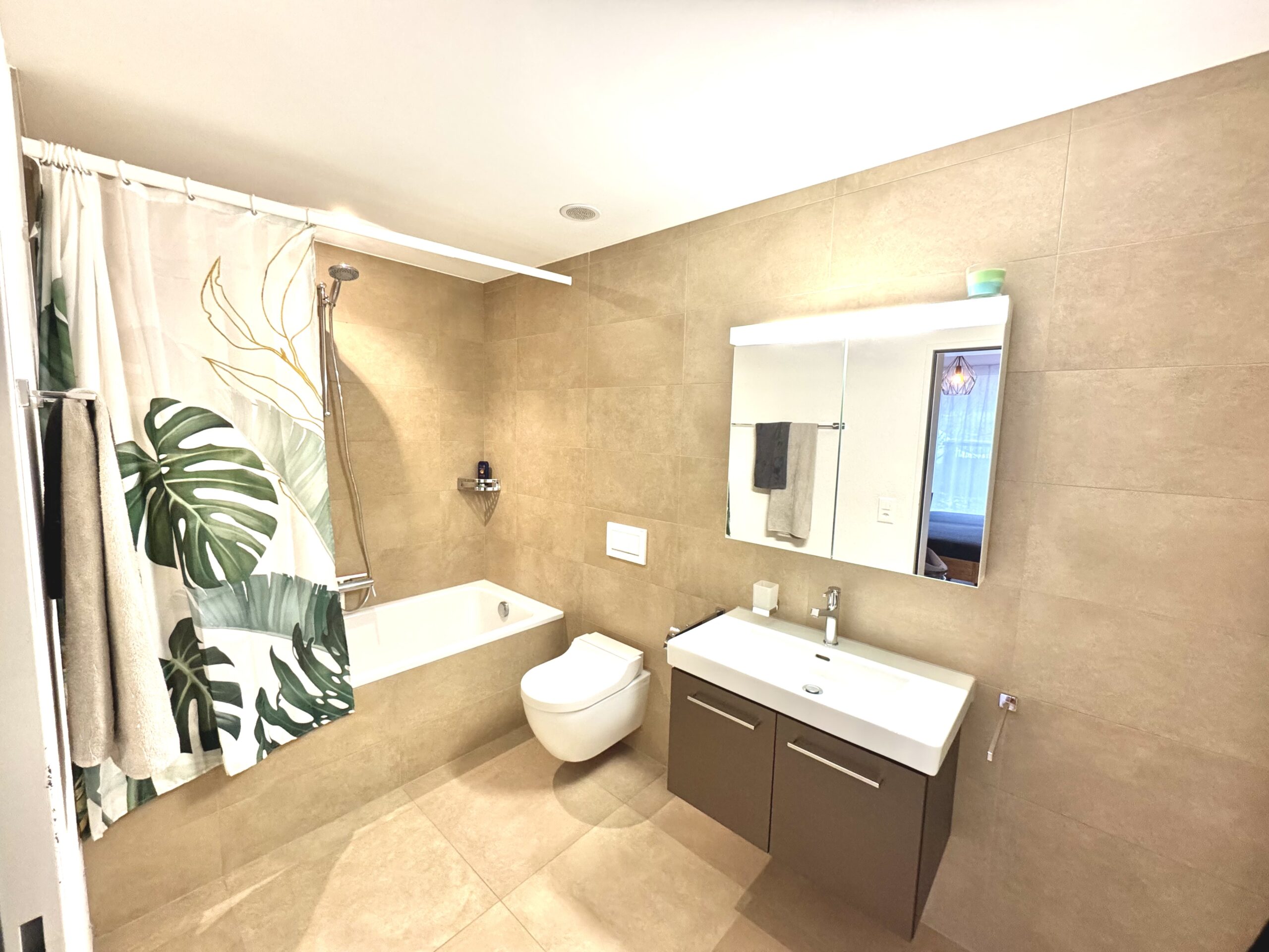 Direkt vom Hauptschlafzimmer zugänglich, bietet dieses Badezimmer einen ruhigen Rückzugsort. Die Badewanne lädt zum Entspannen ein, während die klare Gestaltung und die hochwertigen Materialien für eine angenehme Atmosphäre sorgen. Durch die direkte Verbindung zum Schlafzimmer entsteht ein privater Bereich, der Komfort und Alltagstauglichkeit ideal verbindet.