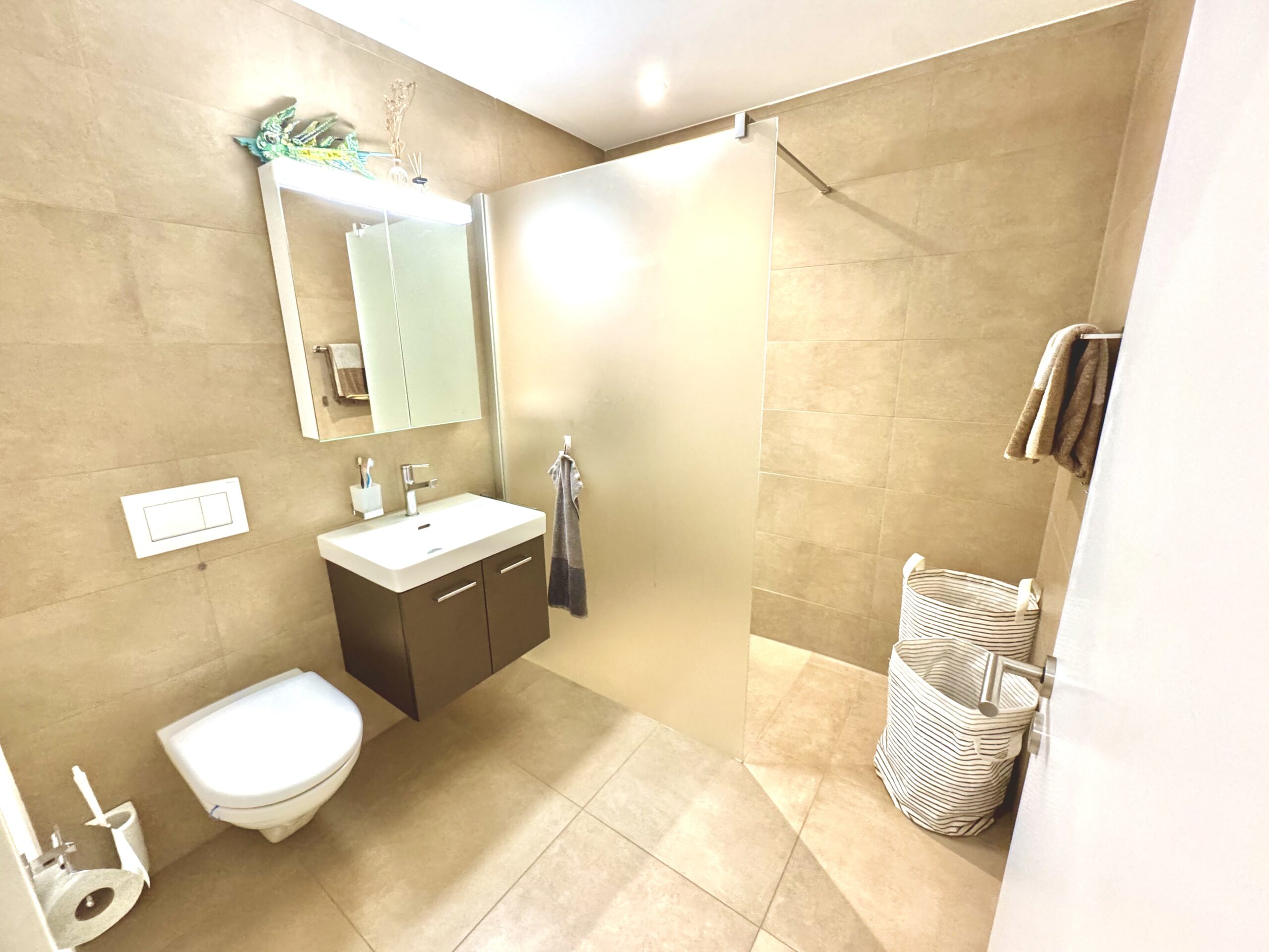 Das zweite Badezimmer ist mit einer begehbaren Dusche ausgestattet und eignet sich perfekt für Gäste oder den täglichen Gebrauch. Die ebenerdige Dusche, das WC und das funktionale Layout machen dieses Bad zu einer praktischen Ergänzung, die den Wohnkomfort spürbar erhöht – auch für Familien oder Besucher.