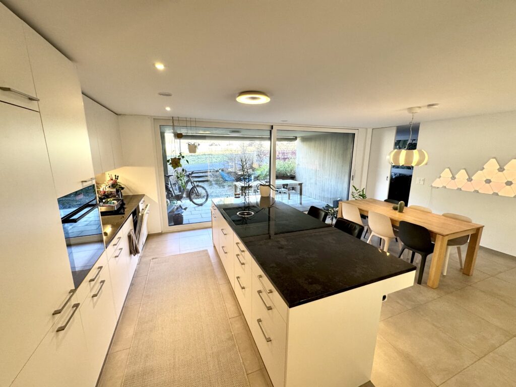 Die moderne Küche mit grosser Kochinsel ist hochwertig ausgestattet und bietet viel Stauraum. Backofen, Kühlschrank, Geschirrspüler und ein Bora-Kochfeld sind harmonisch integriert. Hier wird Kochen zum sozialen Erlebnis – mit Blick in den Wohnraum und direktem Bezug zu den Aussenbereichen.